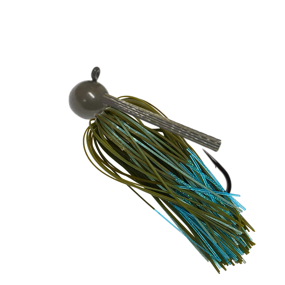 • Green pumpkin Round jig with a green pumpkin and blue silicone skirt and matching green pumpkin weedguard