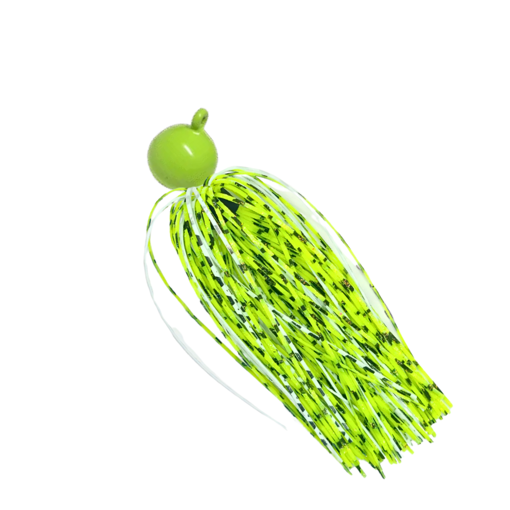• Chartreuse Shake It jig with a chartreuse, white, and silver silicone skirt